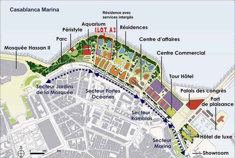 Projekt rezydencyjno-biurowo-handlowy usytowany jest na jednej z działek Ilot A2 Nowej Mariny w Casablance Maroko. Obejmuje 3 wieżowce 16-to piętrowe z 150 mieszkaniami 150-300m2 oraz podwójny wieżowiec biurowca o założeniu open space 5 i 8 pięter. Na parterze od strony wewnętrznego ciągu pieszego znajdują się lokale komercyjne, w podziemiach na 2 poziomach parking na 650 samochodów. Od strony Oceanu działki łączy ogólnodostępny ciąg pieszy, tzw. esplanada. Zarządzałam projektem od etapu koncepcji po realizację dla biura projektowego Aziz Lazrak Architects w Casablance, Maroko.
